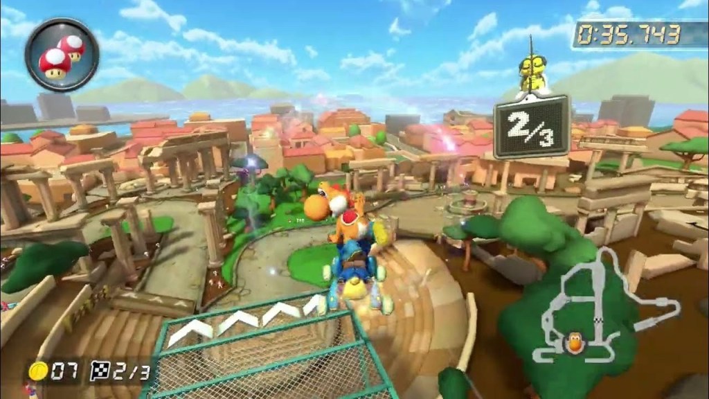 Yayyyyyy! Nintendo giving us DoubleDash fans something to smile about! The second track of the Feather Cup, drivers head to the sea for a cruise through Daisy’s big ass ship, complete with moving tables and swimming pool.