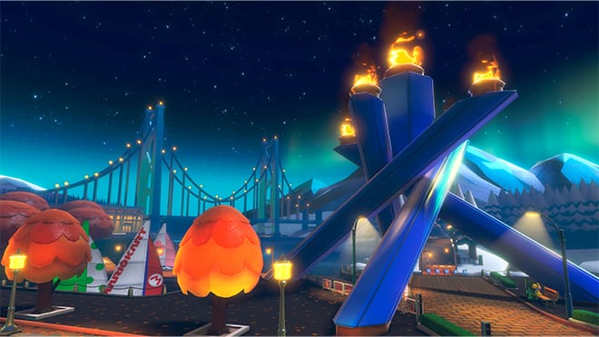 The three paths re-emerge from the beginning of the track, preceding an underwater section with another large Piranha Plant splitting the path before racers take a glider ramp to the final two S-curves.
